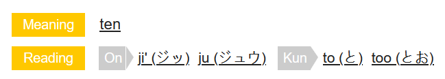 Ca sens l’impasse, je vais voir la prononciation. sur le premier site de Kanjis, on voit deux prononciations “on” et “kun”. Ils n’expliquent pas ce que ça signifie, ça doit être trop évident. Je cherche ailleurs :